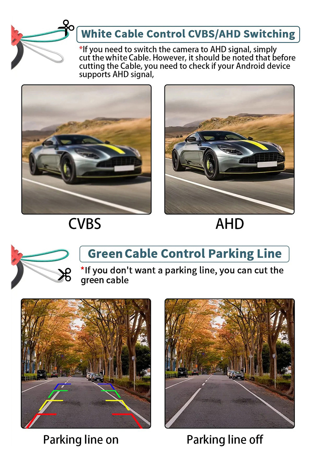 *If you need to switch the camera to AHD signal, simply cut the White cable. However, it should be noted that before cutting the cable, you need to check if your Android device supports AHD signal.