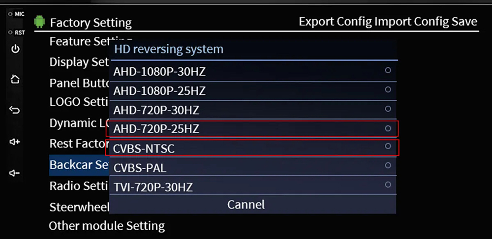 Setting methd: Go to Car settings >>Factory settings>> Reverse (picture) settings >> Select CVBS/AHD 720P